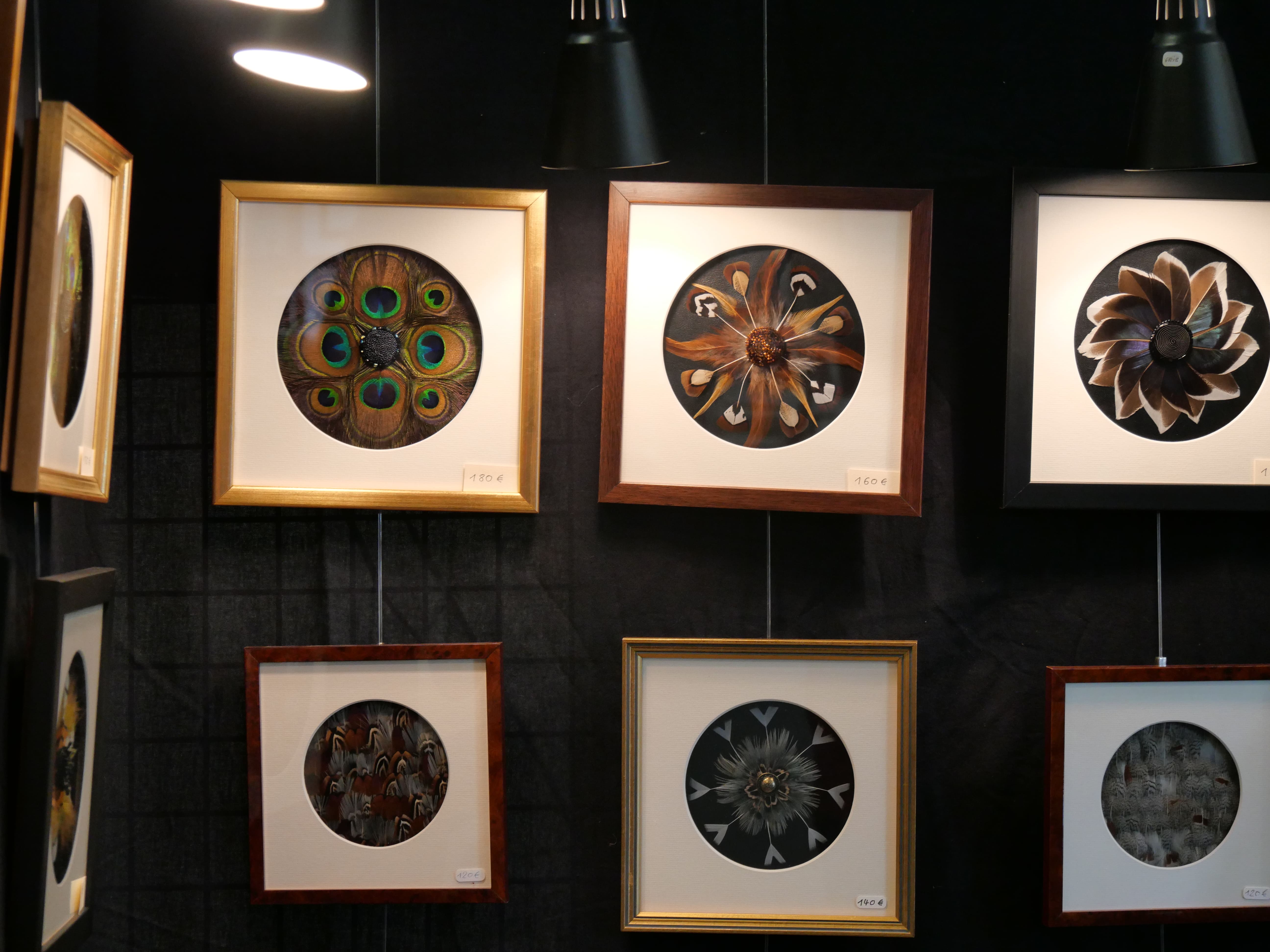 Éric nous présente ensuite ses œuvres, à commencer par les broches situées sur la table devant lui, faites de plumes diverses et variées, puis des médaillons encadrés, fruits d’un travail de six mains.